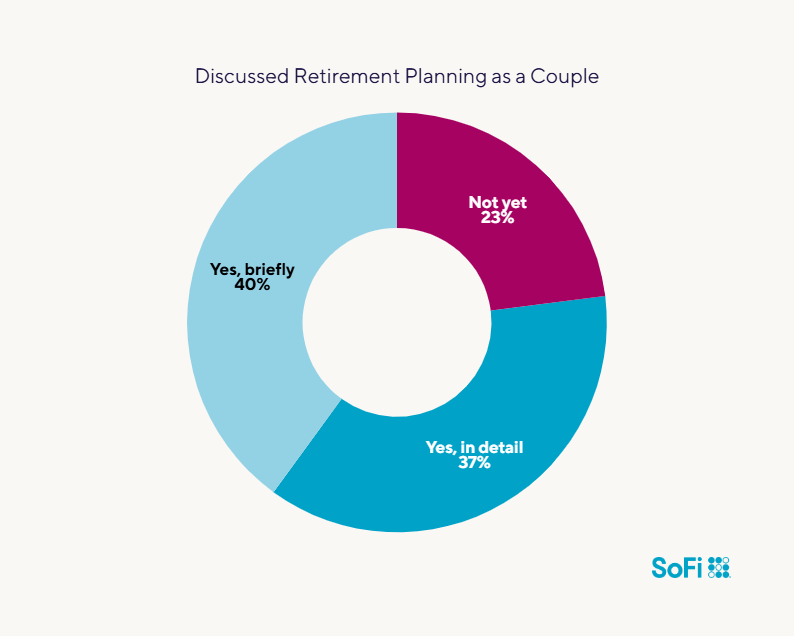 Many couples are talking about retirement early in their relationship. According to SoFi’s 2024 Love & Money Survey of 600 adults in the U.S. who have been married less than one year, 77% have discussed planning for retirement, including 37% who have talked about it in detail.