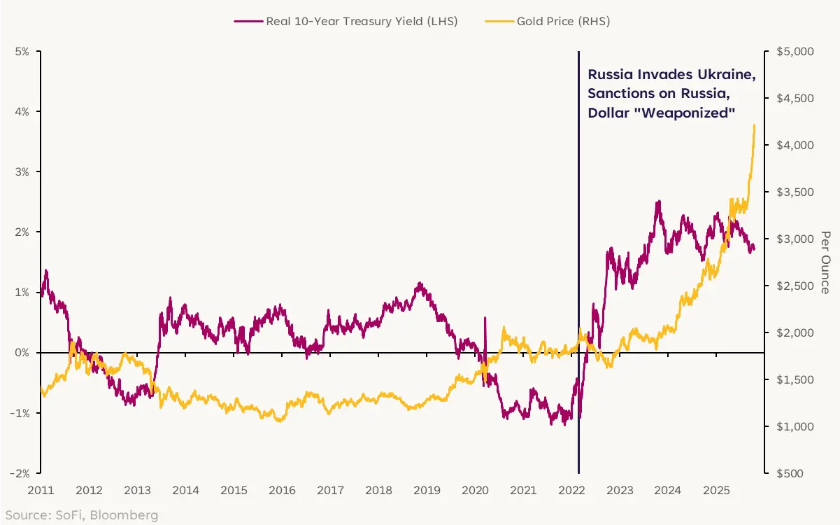 What’s most important about this shift is that unlike most buyers of gold (or really any commodity), central banks and government entities are fundamentally price-insensitive. They’re accumulating gold to buffer foreign reserves against perceived long-term geopolitical risks. This steady sovereign demand effectively has put more of a floor under gold prices, evidently more than offsetting the traditional headwind from high real yields.