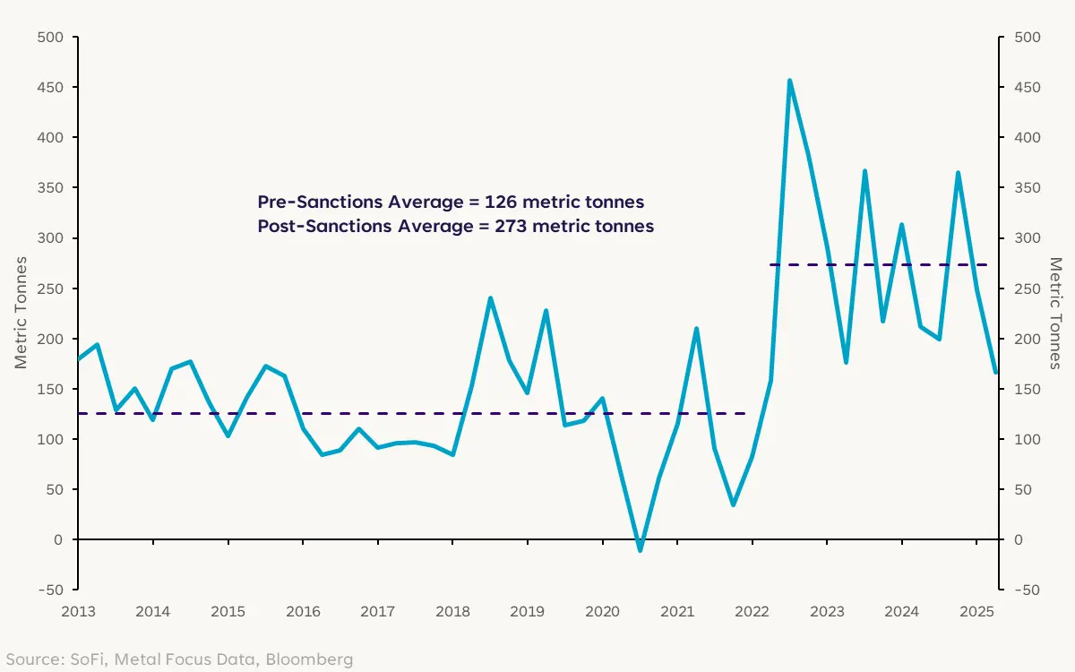 This weaponization of the U.S. dollar triggered a strategic pivot among global central banks to reduce exposure to the dollar and its associated financial infrastructure. The drumbeat of global upheaval since then has only furthered that trend, with gold being the primary beneficiary. Unlike Treasuries or other foreign currency reserves, physical gold held in a country’s vaults can’t be easily frozen or seized. It’s a neutral, universally accepted store of value, which makes it attractive in an uncertain world.