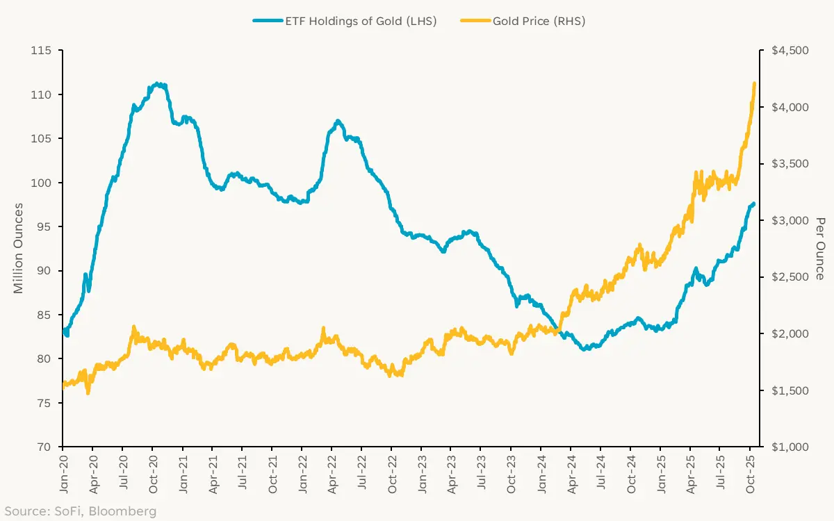 Broadening of the buyer base from sovereign to financial participants has helped boost gold prices even further. Year-to-date price returns now stand at 59.9% as of October 15, one of the best years on record. Despite the strong price momentum, however, total holdings in gold ETFs are still 12.3% below their highest levels in 2020-21. A simple read here might suggest there could still be some room to run.