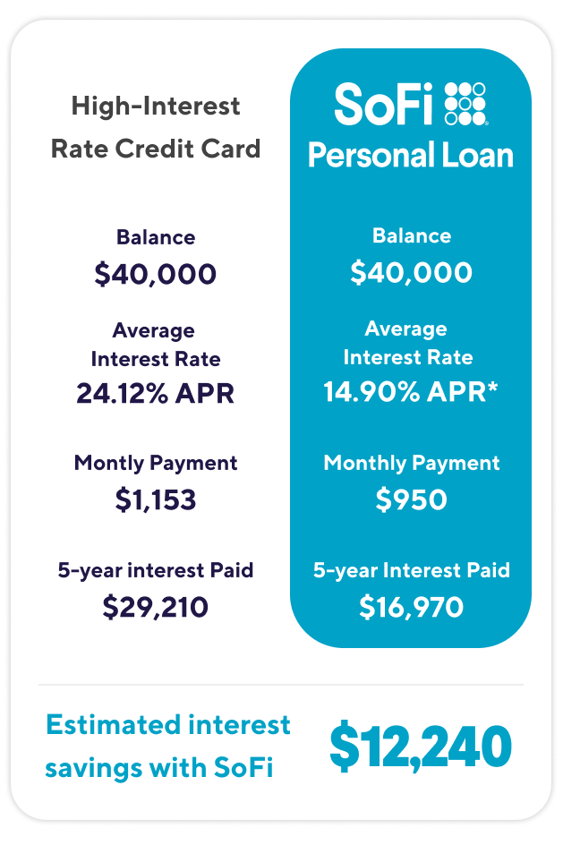 ^ Direct Pay: Terms and conditions apply. Offer good for new personal loan customers with credit cards in their name only and subject to lender approval. To receive the offer, you must: (1) register and/or apply through this landing page; (2) complete a loan application with SoFi within 90 days of your application submit date; (3) meet SoFi’s underwriting criteria; (4) apply 50% or more of your loan proceeds directly to your creditors. Once conditions are met and the loan has been disbursed, the interest rate shown in the Final Disclosure Statement will include an additional 0.25% rate discount. Offer good for new customers only. Cannot be combined with other rate discounts with the exception of the 0.25% autopay rate discount, 0.25% direct deposit discount. SoFi reserves the right to change or terminate the Rate Discount Program to unenrolled participants at any time with or without notice. It takes about 3 business days for your credit card lender to receive payment after your loan is signed. You will be responsible for making all required payments to avoid credit card fees.