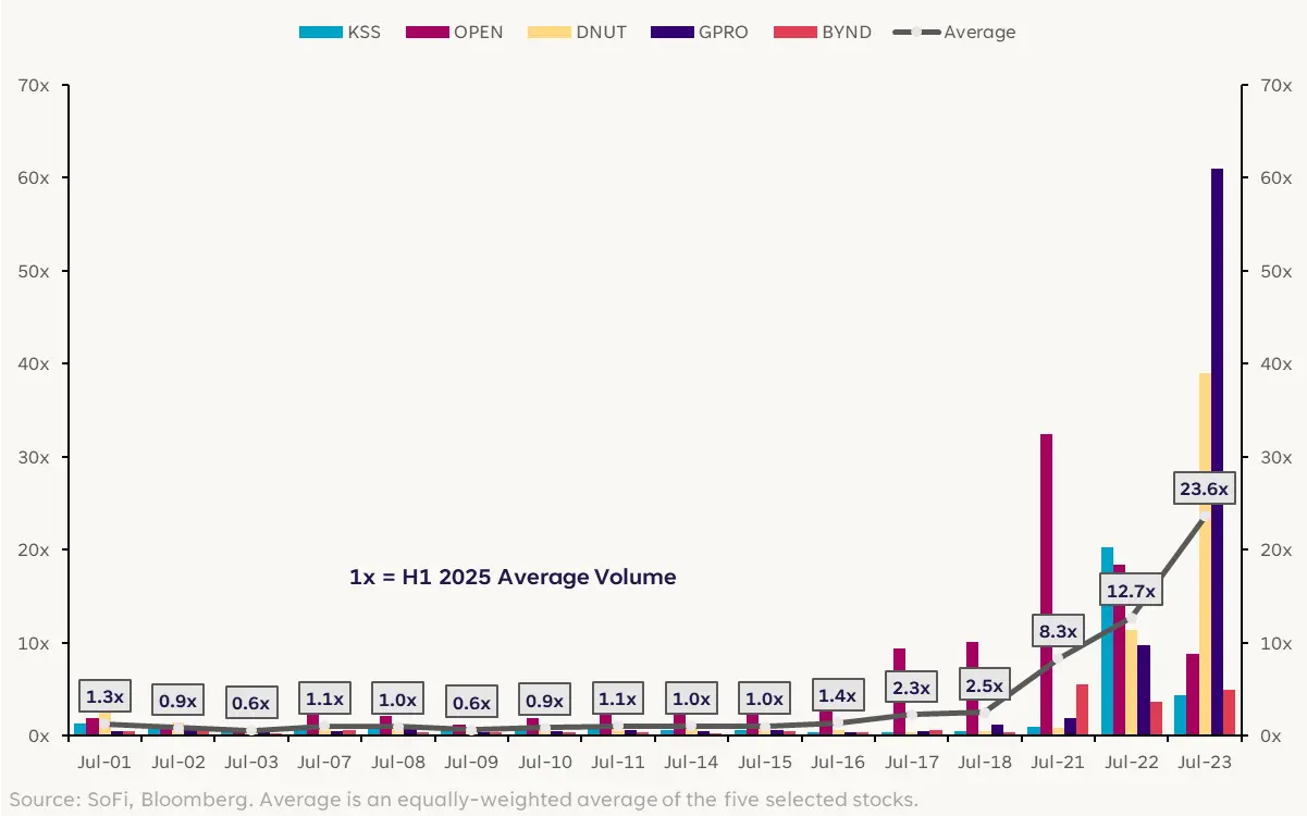Some telltale signs of these dynamics have been on display over the last week or so, with a new batch of meme stocks emerging. For example, Kohl’s (KSS), Opendoor Technologies (OPEN), Krispy Kreme (DNUT), GoPro (GPRO), and Beyond Meat (BYND) have seen major volatility this week, with the stocks experiencing 20-30 percent intraday price swings and trading volumes surging to over 22 times the norm.
