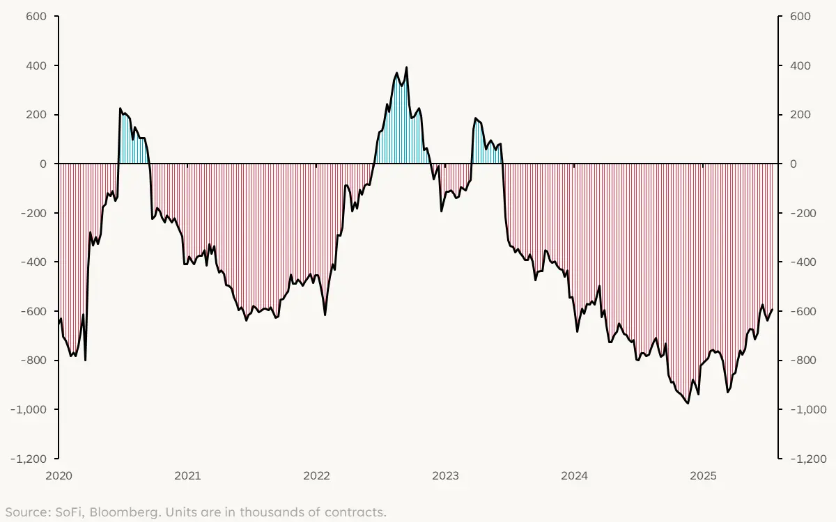 With the S&P 500 now near a record high, one would think that investor bullishness would be back to where it was early in the year. We can proxy for this by looking at dealer positioning in S&P 500 futures, which is updated weekly. Basically, because dealers generally position themselves on the opposite side of investors (in order to maintain overall neutral exposure), we can get an idea of how investors feel. The latest data shows that dealer positioning has gotten less negative since March and is the least negative since early 2024, which means that investors have gotten more negative.