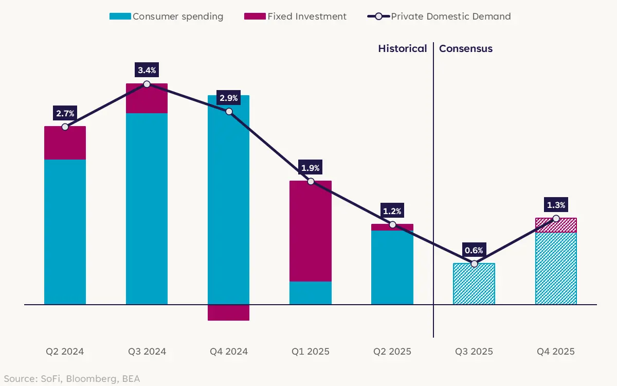 To get a more accurate gauge of underlying economic momentum, one can look at Final Sales to Private Domestic Purchasers (i.e. private domestic demand) which strips out government spending, trade, and inventories to isolate what consumers and businesses are doing. This measure tells a more sobering story: Entering the year at 2.9%, private domestic demand slowed to 1.2% in Q2 and is expected to slow even further next quarter.