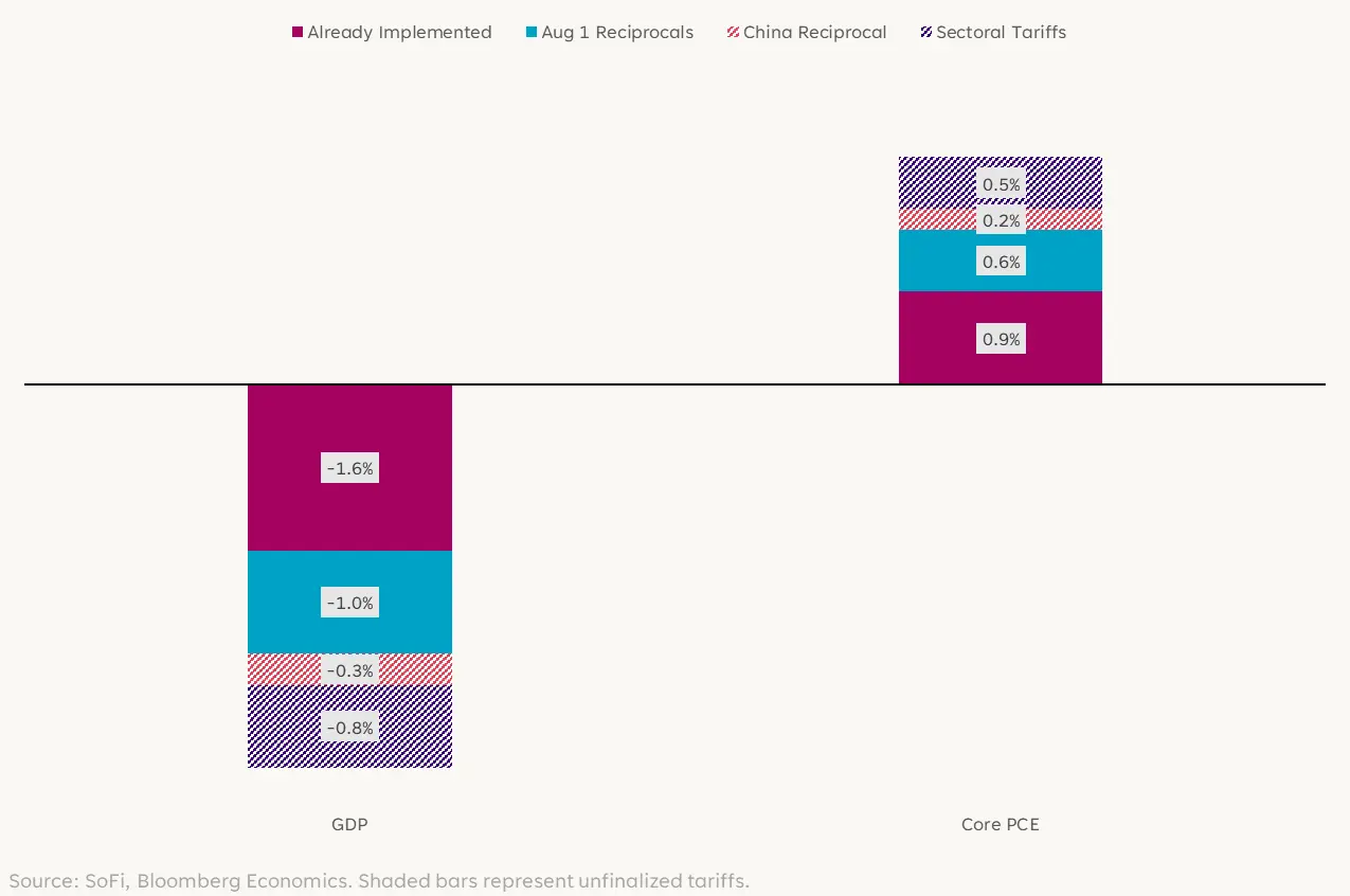 It’s unclear how much of the potential economic impact from tariffs has been priced in, but it’s hard to argue that the risks have fully been internalized. Bloomberg Economics estimates that the 2025 tariffs would reduce GDP by 2.9% and raise core PCE prices by 1.7%. Including the sectoral tariffs on strategically important goods such as semiconductors, copper, and pharmaceuticals that are planned in the future, the GDP and core PCE estimates intensify to 3.7% and 2.2%, respectively.