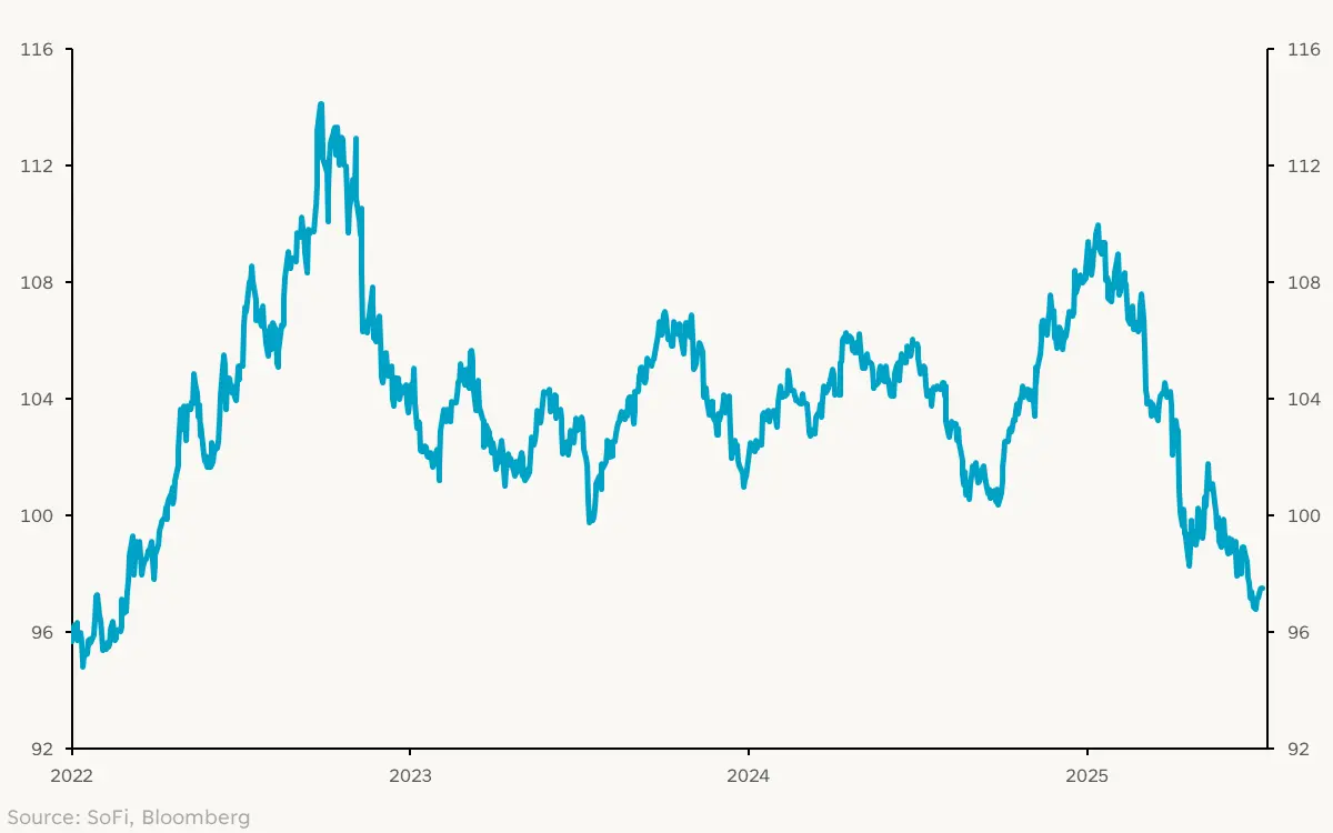 In the first six months of 2025, the index plunged 10.7%, marking its worst first-half performance since 1973. The DXY is trading below 98, near its lows of the last three years. The weakness is being driven by a confluence of factors, including unpredictable U.S. policy and growing fiscal deficits, which are prompting foreign investors to reduce their holdings of dollar-denominated assets.