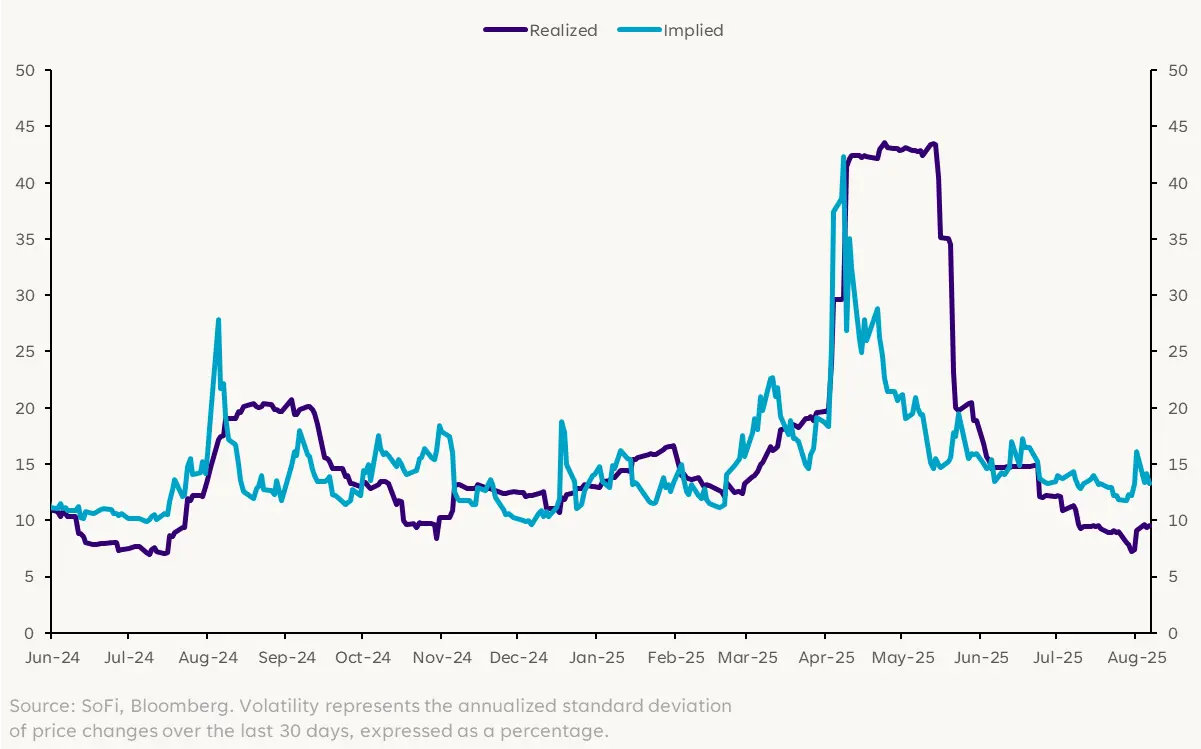 Additionally, investors are jumpy. I say that because when we look at implied volatility (what the options market expects volatility to be over the next 30 days) versus realized volatility (how big the market swings have actually been) we can see that markets expect higher volatility than what we’ve seen lately.