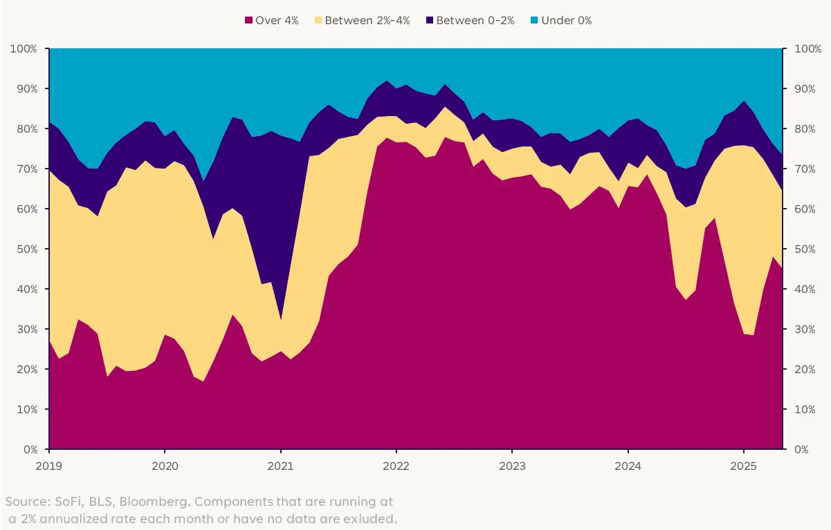 The major jump in components that were running at an above-4% inflation rate (magenta) a couple of years ago jumps out, but more importantly for investors is the recent increase in the number of components at a below-2% inflation rate (blue and purple).