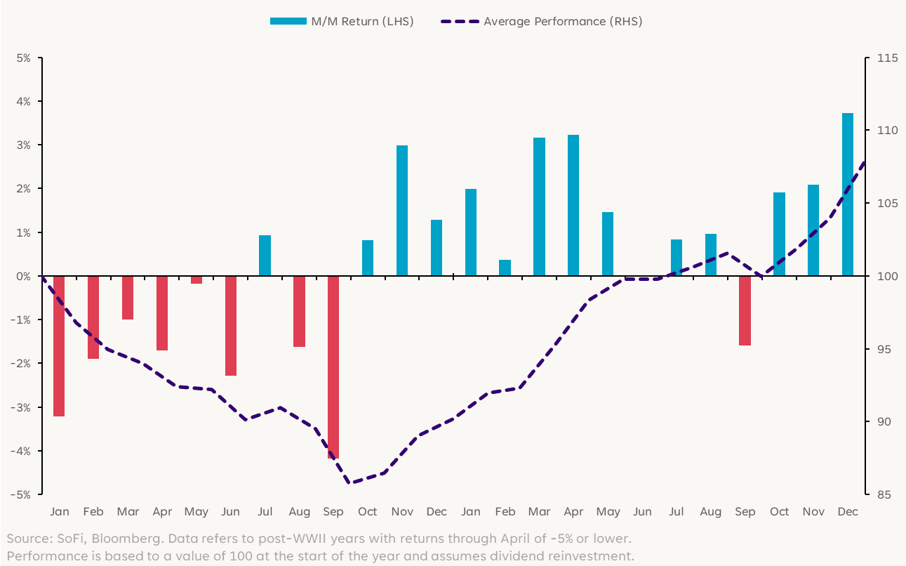 The chart above tracks the performance of stocks in the 13 post-WWII years where they were down 5% or more through April, and shows how they performed in the following months. Here are some key takeaways: