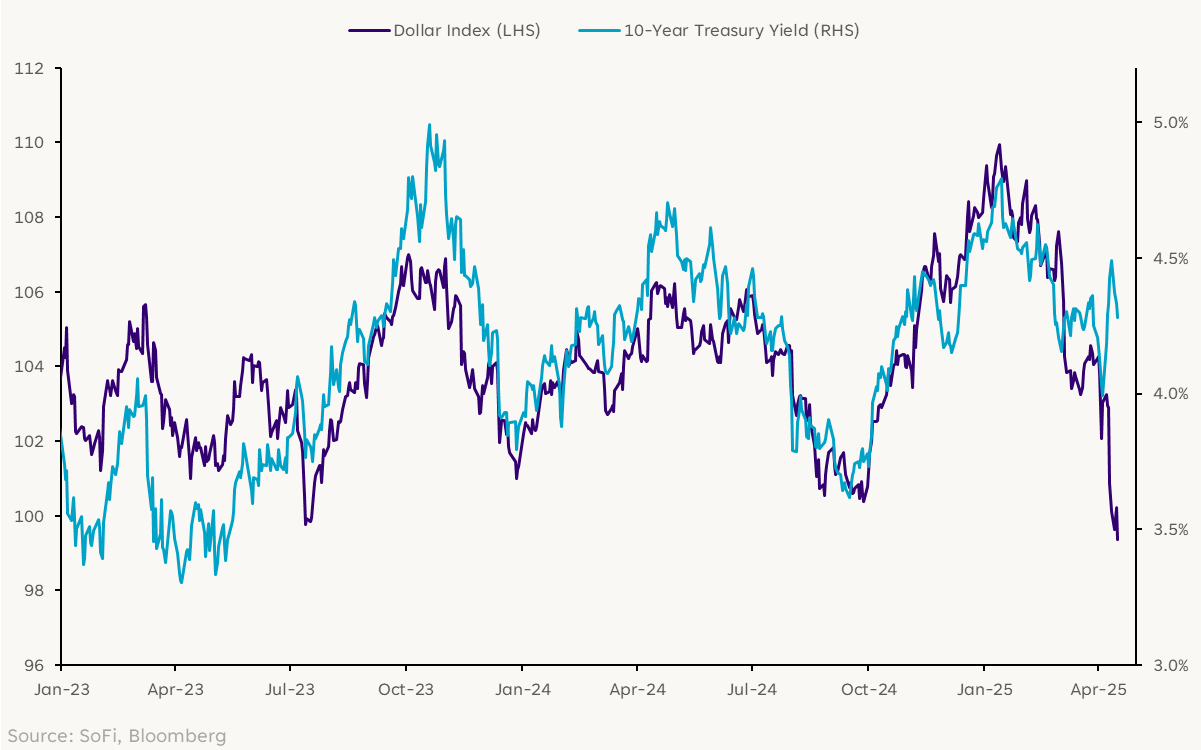 However, there’s been a divergence in this pattern recently with the dollar weakening even though Treasury yields have risen. Since the end of February, the DXY is down 7.7%, while 10-year yields are 7 basis points higher.