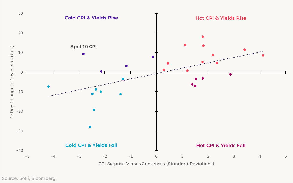 The following scatterplot shows the move in the 10-year Treasury yield relative to CPI surprises since the start of 2022, with the recent CPI report a notable outlier.