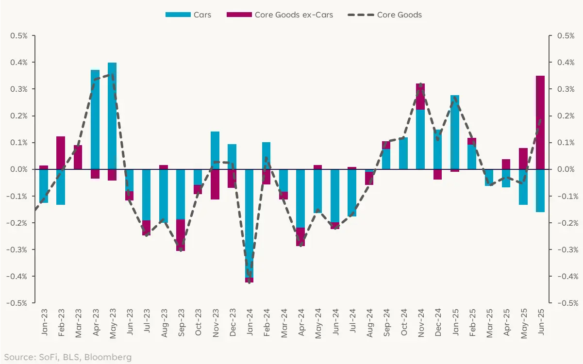 For example, the core goods component rose 0.2% in June. That might not sound like a big deal, but it’s noteworthy because it occurred despite new and used cars falling 0.3% and 0.7%, respectively. Those items represent 35% of the entire core goods basket, which suggests that inflation in core goods minus cars was hot.